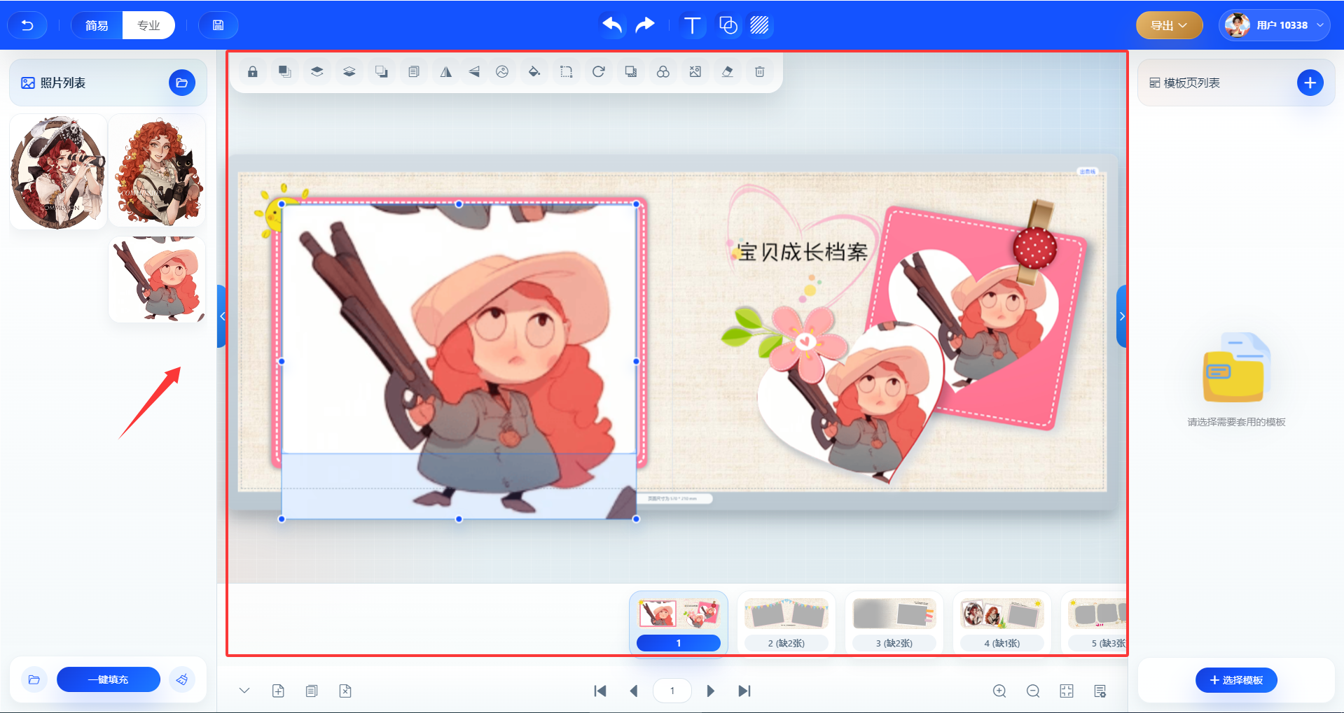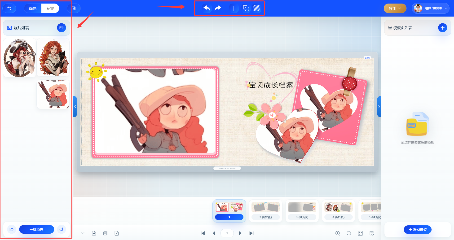 软件自带不少模板,按照相册类型选就行,比如婚纱、儿童、旅行等分类。选中模板后双击,模板就会加载到编辑区。如果不喜欢自带模板,也可以自定义尺寸。